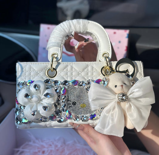 Each bag is adorned with premium rhinestones, carefully hand-set to reflect a dazzling brilliance—like carrying a piece of a fairy tale. The shimmering black and silver tones are accented with a delicate touch of pink, blending playful nostalgia with modern elegance.