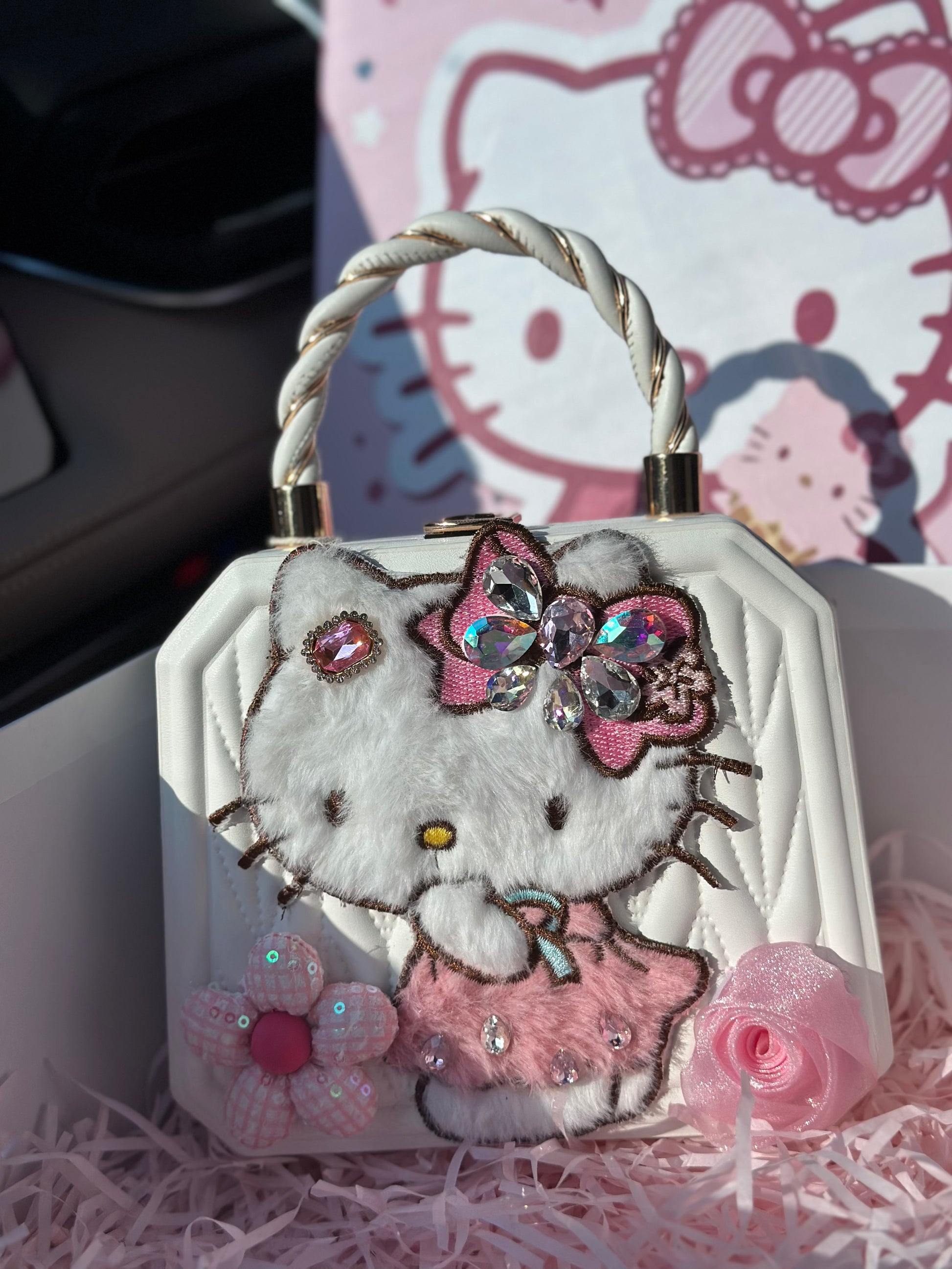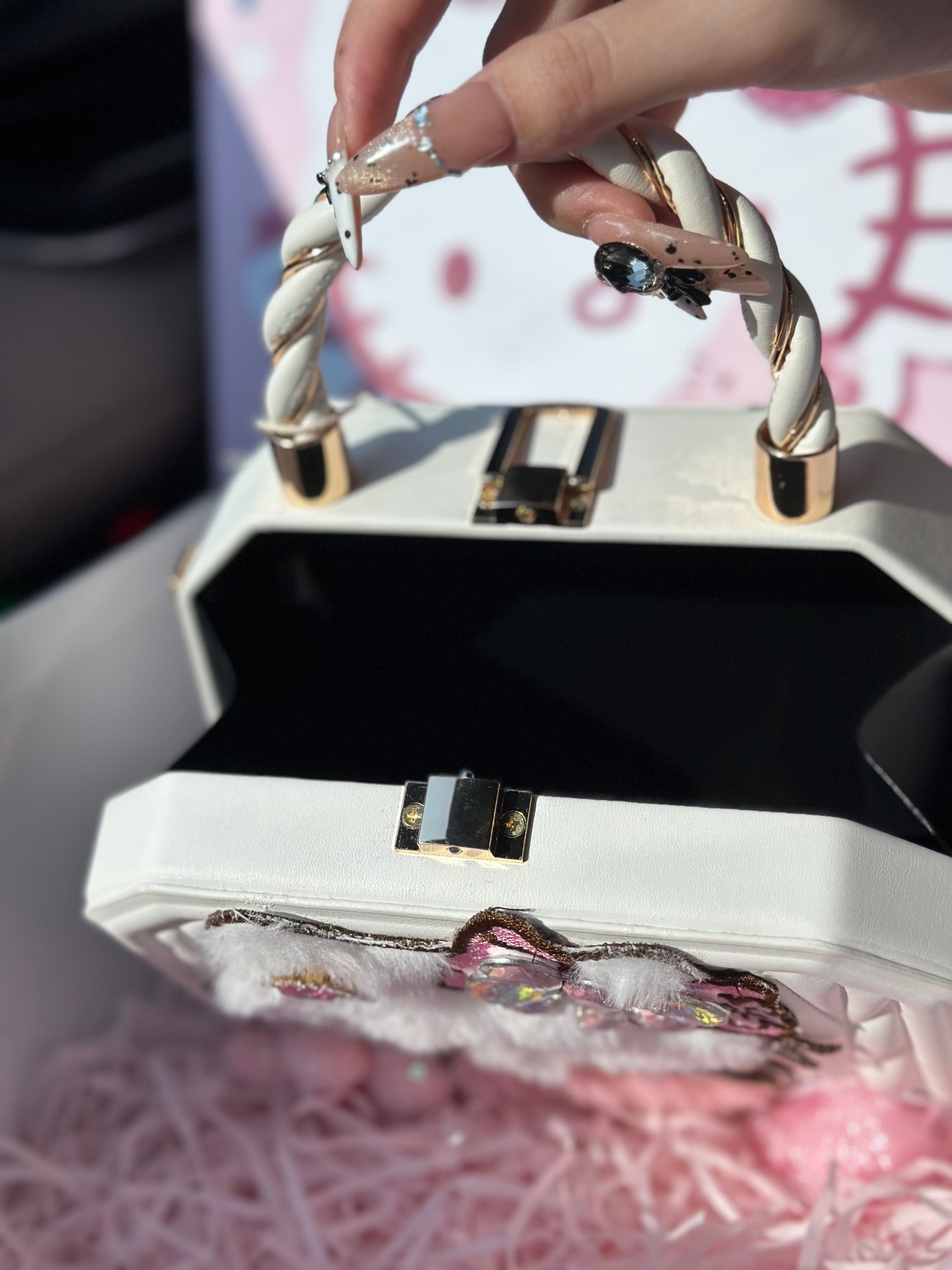 This chic white hard box cat bag features a sleek and structured design with playful cat-inspired details. Perfect for adding personality and a modern edge to your outfits.