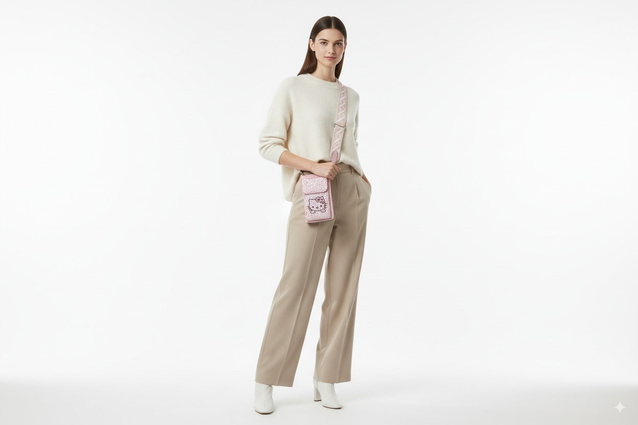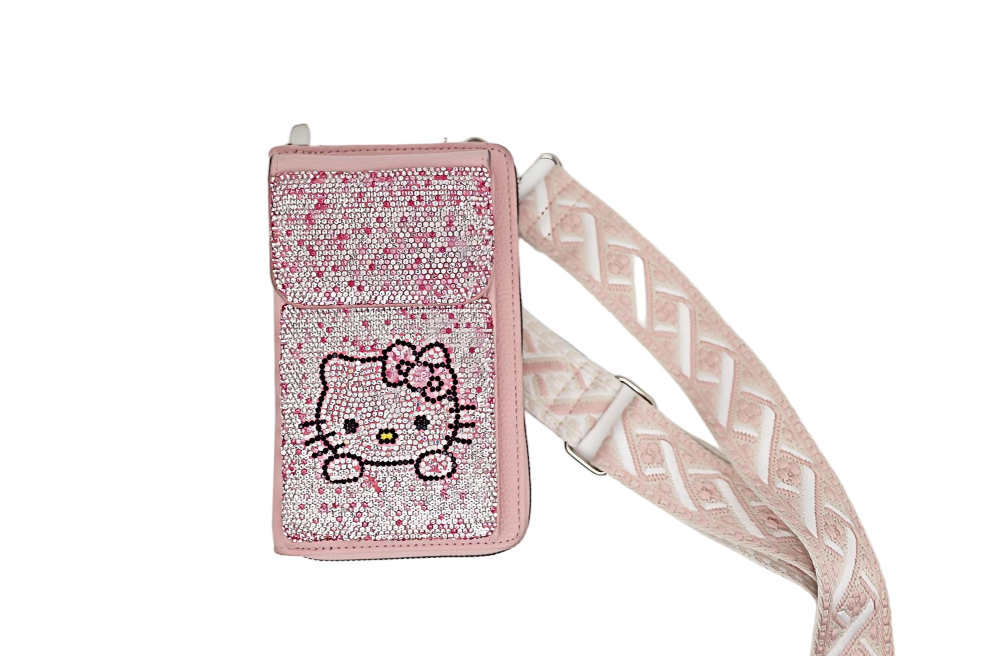 A sparkling pink mobile phone case with shimmering hot diamonds and a trendy shoulder strap. Carry your essentials in style while keeping your hands free.