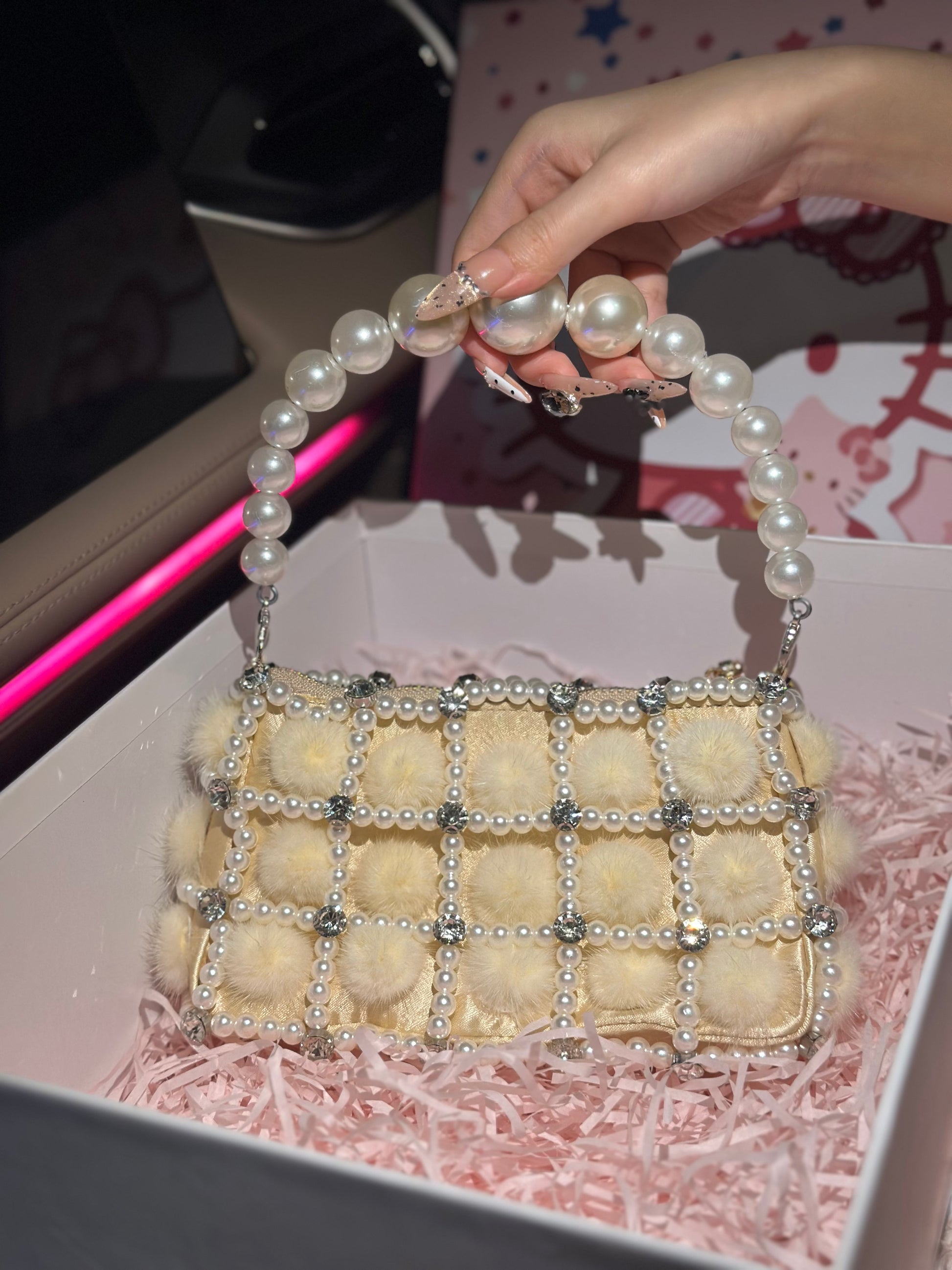The pearl check plush hand-held bag blends soft textures with chic pearl patterns. Cozy, fashionable, and ideal for adding a touch of luxury to your style.